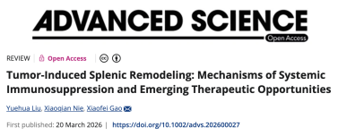 26年3月21日,西湖大学未来产业研究中心高晓飞受邀为《Advanced Science》杂志“Advances in Cancer Immunotherapy”专题撰写综述,在线发表了题为“Tumor-Induced Splenic Remodeling: Mechanisms of Systemic Immunosuppression and Emerging Therapeutic Opportunities”的综述文章。该文章系统阐述了肿瘤诱导脾脏重塑的分子机制、其介导全身免疫抑制的核心作用,以及靶向脾脏的新型肿瘤免疫治疗策略,为突破免疫检查点阻断疗法的疗效瓶颈、开发下一代肿瘤免疫治疗手段提供了重要的理论基础和研究方向。