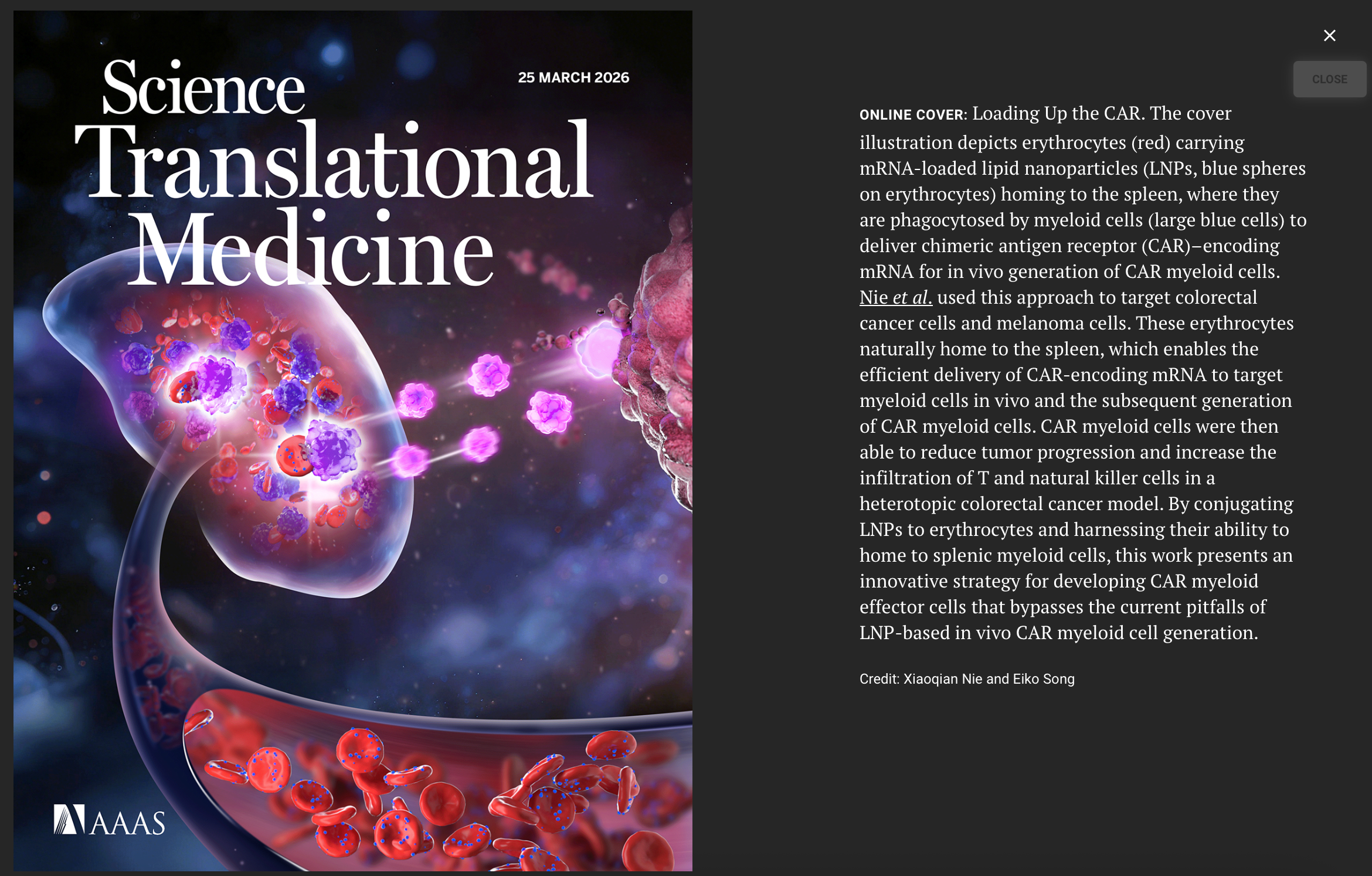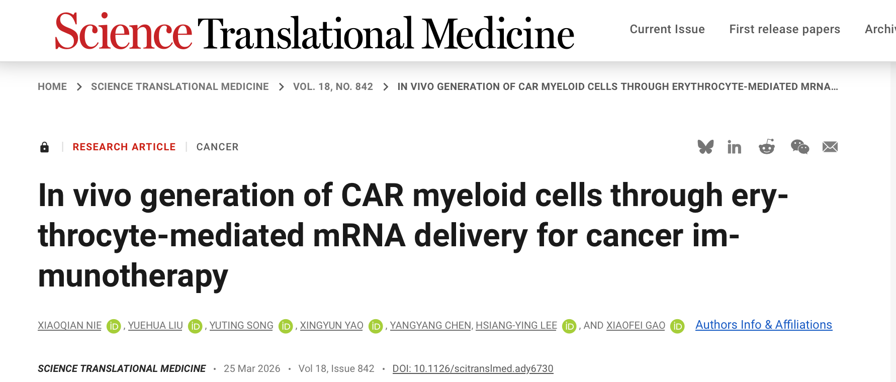 2026年3月25日,课题组联合北京大学李湘盈课题组在Science Translational Medicine在线发表题为In vivoGeneration of CAR-Myeloid Cells through Erythrocyte-Mediated mRNA Delivery for Cancer Immunotherapy的研究论文,并入选同期封面文章。该研究提出了一种不同于传统LNP递送的全新策略:通过将mRNA-LNP共价偶联至红细胞表面,利用红细胞天然归巢脾脏并与免疫系统互作的生理机制,实现对髓系细胞的高效靶向递送,并在体内直接生成具有抗肿瘤活性的CAR-髓系细胞(CAR-M)。与依赖被动分布且主要富集于肝脏的传统LNP不同,该策略通过“生理路径”实现对免疫器官的主动靶向,并通过吞噬途径提高mRNA释放效率,从而显著提升体内表达与治疗效果。基于团队已建立的红细胞–药物偶联平台及其临床验证基础(2026, Nature Cancer),该策略有望加速红细胞-核酸药物的临床转化进程。